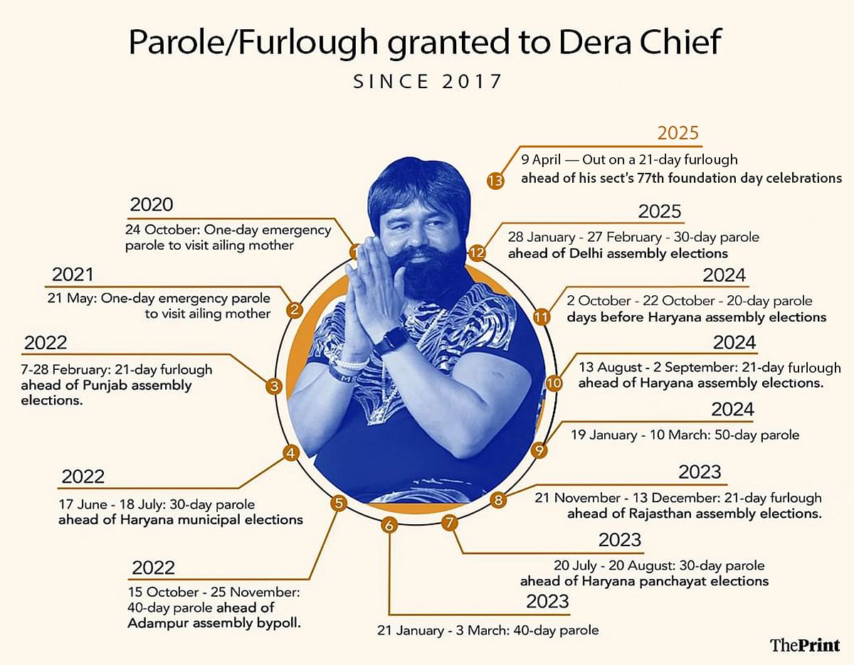 उनकी ज्यादातर अस्थायी रिहाई चुनावों के साथ हुई है, चाहे वह पंचायत, राज्य या राष्ट्रीय चुनाव हों. वास्तव में, डेरा मुख्यालय ने पिछले साल अक्टूबर में अपने अनुयायियों से हरियाणा चुनावों में भारतीय जनता पार्टी (बीजेपी) का समर्थन करने का आह्वान किया था.