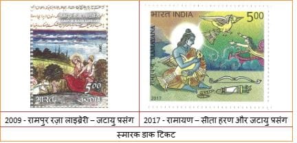 उत्तर प्रदेश के रामपुर में प्रसिद्ध रज़ा लाईब्रेरी में अठारहवीं शताब्दी में सुमेर चंद द्वारा फारसी नस्तलिक लिपि में रची गयी सचित्र वाल्मीकि रामायण की एक प्रति है. 2009 में रामपुर रज़ा लाईब्रेरी पर जारी किये गए चार टिकटों में से एक टिकट पर जटायु और राम एवं लक्ष्मण के मिलने के प्रसंग को दर्शाया गया. फिर 2020 में घुमन्तु गायकों के छह वाद्ययन्त्रों पर बारह टिकट जारी हुए. इनमें से एक वाद्ययंत्र का नाम रावणहत्था है. हालांकि टिकट की विवरणिका में इस नाम का रावण से जुड़े होने का उल्लेख नहीं है. इसी तरह 2023 में परशुराम पर निकाले गए टिकट की विवरणिका में रामायण का ज़िक्र तो है किन्तु उन्हें मुख्यतः महाभारत के पात्र के रूप में चित्रित किया गया है. 18 जनवरी 2024 को जारी बुकलेट में ये दोनों टिकट सम्मिलित हैं.