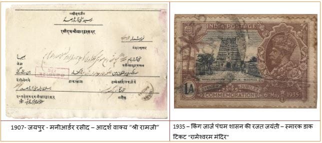इस दौरान राम और हनुमान से जुड़े राजप्रतीक और आदर्श वाक्य रियासतों के सरकारी लिफाफों और पोस्टकार्ड पर देखने को मिले. व्यापारी और आम लोग पत्राचार की शुरुआत राम-राम के साथ करते और लिफ़ाफ़ों एवं पोस्टकार्ड पर रामायण से प्रेरित चित्र छपने लगे. रामायण की डाक यात्रा में एक नया अध्याय 1935 में जुड़ा जब जॉर्ज पंचम के शासन की रजत जयंती के अवसर पर रामेश्वरम मंदिर समेत भारत के स्मारकों पर सात टिकट जारी हुए.
