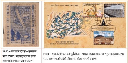 आज़ादी के बाद पहले गणतंत्र दिवस (1950) पर सरकार ने चार स्मारक डाक टिकट जारी किये. इनमें से एक पर गांधी जी के प्रिय भजन की एक पंक्ति “रघुपति राघव राजा राम पतित पावन सीता राम” उद्धृत है. हाल ही में 75वें गणतंत्र दिवस के अवसर पर “भारत-लोकतंत्र की जननी” के सन्देश को लोगों तक पहुंचाने के लिये तीन डाक टिकट जारी हुए. इन टिकटों के प्रथम दिवस आवरण पर पुष्पक विमान पर सवार राम, लक्ष्मण और देवी सीता के अयोध्या लौटने के दृश्य को दिखाया गया है. यह चित्र भारतीय संविधान की मूल प्रति में मौलिक अधिकार के अध्याय से लिया गया है.