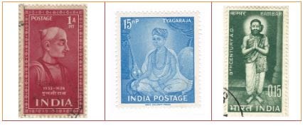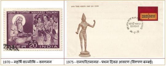 साठ के दशक में कवि कालिदास (1960) पर जारी टिकट विवरणिका में उनकी कृति “रघुवंशम्” से दो श्लोक अंग्रेजी में अनुवाद के साथ उद्धृत किये गए. इसके बाद 1961 में महान संगीतज्ञ त्यागराज की 114वीं पुण्यतिथि पर जारी टिकट की विवरणिका में तेलुगु में उनकी रचित ‘रामकथा सुधा’ से कुछ पंक्तियां अंग्रेजी में अनुवाद के साथ उद्धृत की गईं. फिर चोलकालीन कवि कम्बर (1966) और महर्षि वाल्मीकि (1970) पर डाक टिकट निकाले गए. वाल्मीकि के टिकट पर राम, लक्ष्मण और देवी सीता के वनगमन का बड़ा सुन्दर चित्रण देखने को मिलता है.