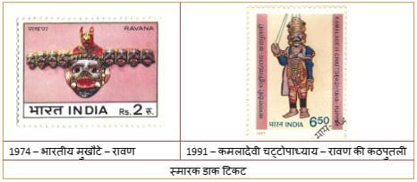 हमारे जीवन में रामकथा सिर्फ मंदिरों और साहित्य तक सीमित नहीं है. इस बात की झलक डाक टिकटों पर भी देखने को मिलती है. सन् 1974 में लोक नाटकों में प्रयोग किये जाने वाले मुखौटों पर चार टिकट जारी हुए, जिनमें से एक पर रामलीला में रावण के दशानन रूप का मुखौटा था. राष्ट्रीय नाट्य विद्यालय की संस्थापक एवं स्वतंत्रता संग्राम सेनानी कमलादेवी चट्टोपाध्याय (1991) पर जारी डाक टिकट में रावण कठपुतली के रूप मेंचित्रित है.