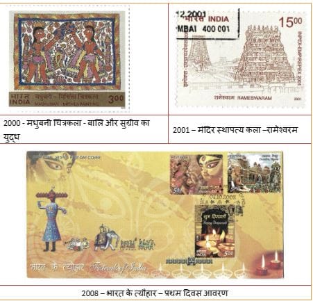 फिर 2000 में मधुबनी-मिथिला चित्रकला पर जारी चार डाक टिकटों में से एक बालि और सुग्रीव के युद्ध पर आधारित है . मंदिर स्थापत्य-कला शैली (2001) के अंतर्गत जारी चार टिकटों में से एक बहुप्रसिद्ध रामेश्वरम मंदिर पर है. 2008 में दीपावली और मैसूर एवं कोलकाता के दशहरों पर तीन डाक टिकट जारी हुए और उनके प्रथम दिवस आवरण पर दशानन का पुतला दिखाया गया.