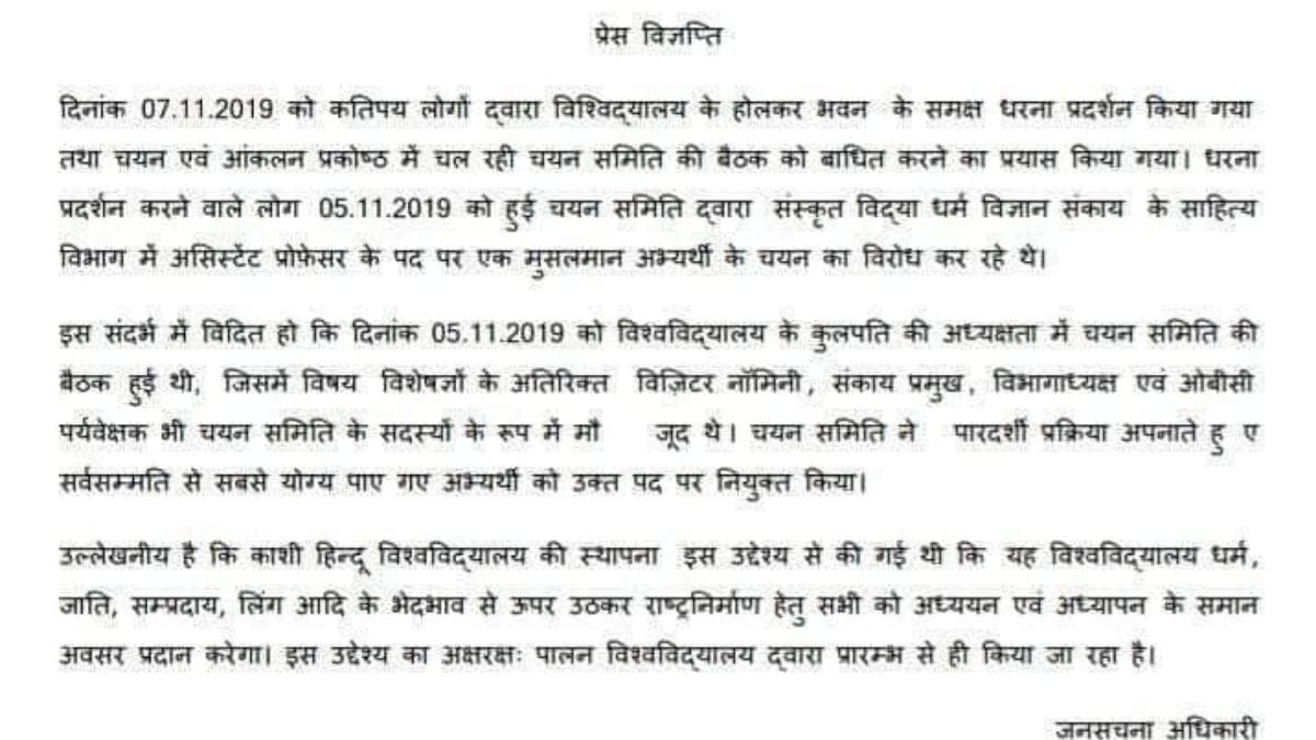 7 नंवबर को शुरू हुए इस धरने के बाद यूनिवर्सिटी ने इस नियुक्ति को लेकर एक स्पष्टीकरण जारी करते हुए साफ कहा था, ‘काशी हिंदू विश्वविद्यालय की स्थापना इस उद्देश्य से की गई थी कि यह विश्वविद्यालय जाति, धर्म, लिंग और संप्रदाय आदि के भेदभाव से ऊपर उठकर राष्ट्रनिर्माण हेतु सभी को अध्ययन व अध्यापन के समान अवसर देगा.’ लेकिन इसके बावजूद छात्र अपनी मांग पर अड़े हुए हैं. गौरतलब है कि प्राचीन शास्त्रों, ज्योतिष और वेदों व संस्कृत साहित्य को पढ़ाने वाले इस संकाय की स्थापना 1918 में हुई थी.