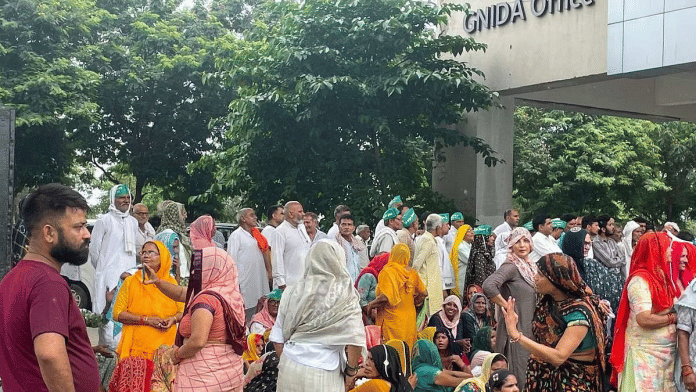 पिछले हफ्ते जब दिप्रिंट ने ग्रेटर नोएडा का दौरा किया था, तब सैकड़ों सफ़ाई कर्मचारी जीएनआईडीए कार्यालय के बाहर जमा हो गए थे, जिनमें से कुछ ज़मीन पर बिछाए गए कालीनों पर बैठे थे.