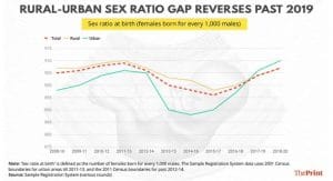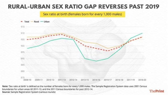 2008-10 में, जन्म के समय शहरी भारत का लिंगानुपात 898 था, जो 2011-13 तक बढ़कर 906 हो गया. बाद के वर्षों में यानी 2014-16 तक यह अनुपात गिरकर 888 पर आ गया. फिर यह 2017-19 में ग्रामीण भारत से आगे निकल गया.