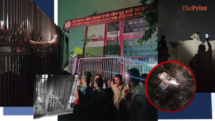 अंधेरे और सुनसान इलाके में बने इस रोहिणी सेंटर के बाहर भीड़ जमा थी. सौ से ज़्यादा लोग थे—कुछ गेट पर धक्का-मुक्की कर रहे थे, कुछ शांत रहकर अपने-अपने इलाकों के कुत्तों को ढूंढ रहे थे, और कुछ लोग माहौल शांत कराने की कोशिश कर रहे थे.