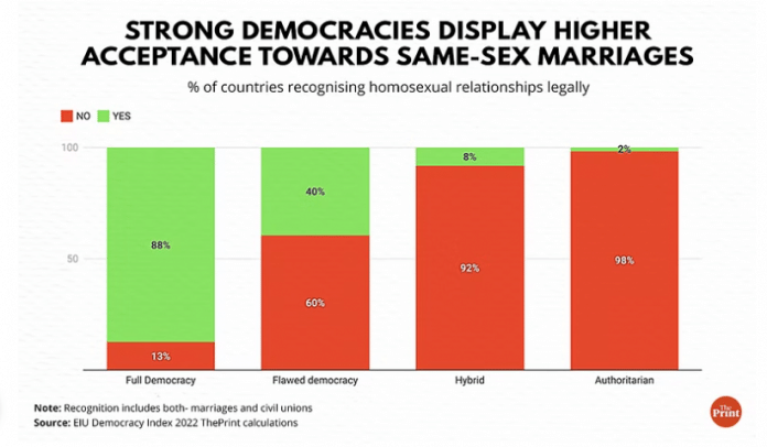 यह विरोध “लोकतंत्र की जननी” के रूप में भारत की छवि के साथ कैसे मेल खाता है? दिप्रिंट ने दि इकोनॉमिस्ट इंटेलिजेंस यूनिट के डेमोक्रेसी इंडेक्स 2022 के निष्कर्षों की जांच की और इसे 167 देशों में समलैंगिक यूनियनों की वैधता की स्थिति के साथ मापा किया.
