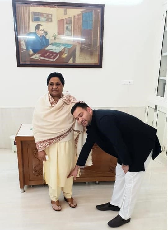 यहीं पर वो तस्वीर खींची गई, जिसमें तेजस्वी झुककर मायावती के पैर छू रहे हैं और मायावती उन्हें आशीर्वाद दे रही हैं. जो तस्वीर तेजस्वी यादव के वाल पर लगी है, उसमें इस बात का खास ध्यान रखा गया है कि बाबा साहब की फोटो कट न जाए.