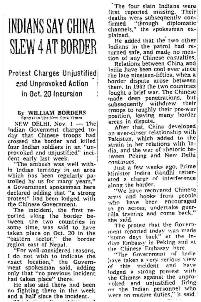भारत सरकार के एक अधिकारी ने द न्यू यॉर्क टाइम्स को उस समय बताया था कि भारतीय क्षेत्र के भीतर घात लगाया गया था, जहां कई वर्षों से हमारे द्वारा नियमित रूप से गश्त किया जाता था. अधिकारी ने यह भी कहा कि भारत ने चीनी सरकार का ‘जोरदार विरोध’ दर्ज किया था.