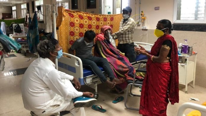 लक्ष्मी राम, जिनके ऑक्सीजन लेवल में सुधार के लिए साथ में मौजूद परिवार के चार सदस्य उनका शरीर लगातार रगड़ रहे हैं, ने दिप्रिंट से बातचीत में कहा कि उन्होंने तो बचने की सारी उम्मीदें छोड़ दी हैं.