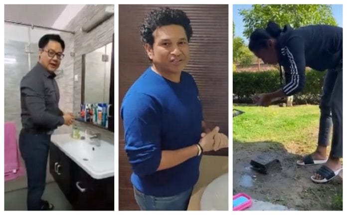 देश के खेल मंत्री किरेन रिजीजू ने सिंधु और हिमा के चैलेंज को स्वीकार करते हुए अपना वीडियो शेयर किया है और लोगों से सुरक्षित और संक्रमण से बचने की अपील करते हुए वीडियो शेयर किया है और उन्होंने भी अपने राजनीतिक समकक्षों जिसमें स्मृति ईरानी सहित बॉलीवुड और खेल के दुनिया के कई लोगों को इस अभियान से जुड़ने की अपील की है. मास्टर ब्लास्टर सचिन तेंदुलकर भी इस अभियान में शामिल हो चुके हैं और उन्होंने भी अपना हाथ धोते हुए वीडियो शेयर किया है.वह अपने प्रशंसकों को सिर्फ हाथ धोना ही नहीं सुखाने के लिए भी जानकारी दे रहे हैं.