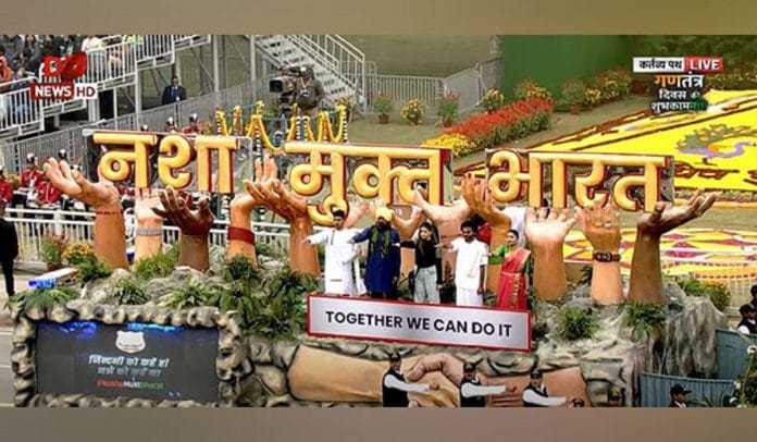 झांकी के किनारों पर, भारत के विभिन्न हिस्सों से संबंधित लोगों को ‘एक साथ हम यह कर सकते हैं’ आदर्श वाक्य के साथ ड्रग्स से लड़ने का संकल्प लेते हुए दिखाया गया है.