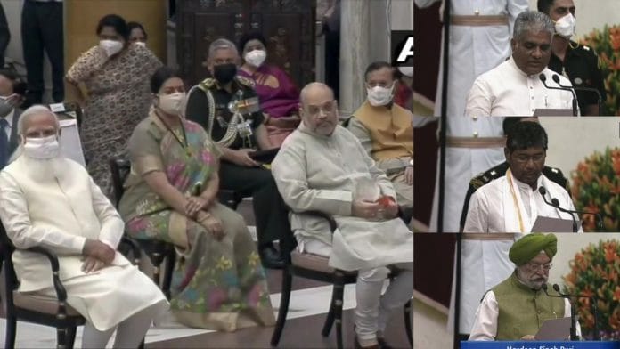कैबिनेट मंत्री के रूप में महाराष्ट्र से राज्यसभा के सदस्य नारायण राणे, असम के पूर्व मुख्यमंत्री सर्बानंद सोनोवाल, पूर्व केंद्रीय मंत्री व मध्य प्रदेश के टीकमगढ़ से सांसद वीरेंद्र कुमार, मध्य प्रदेश से राज्यसभा सदस्य ज्योतिरादित्य सिंधिया, जनता दल यूनाईटेड के राष्ट्रीय अध्यक्ष व राज्यसभा सदस्य राम चंद्र प्रसाद सिंह, ओड़िशा से भाजपा के राज्यसभा सदस्य अश्विनी वैष्णव और लोक जनशक्ति पार्टी के पारस गुट के अध्यक्ष पशुपति कुमार पारस ने शपथ ली.