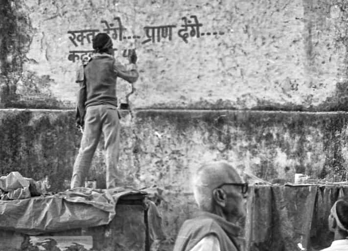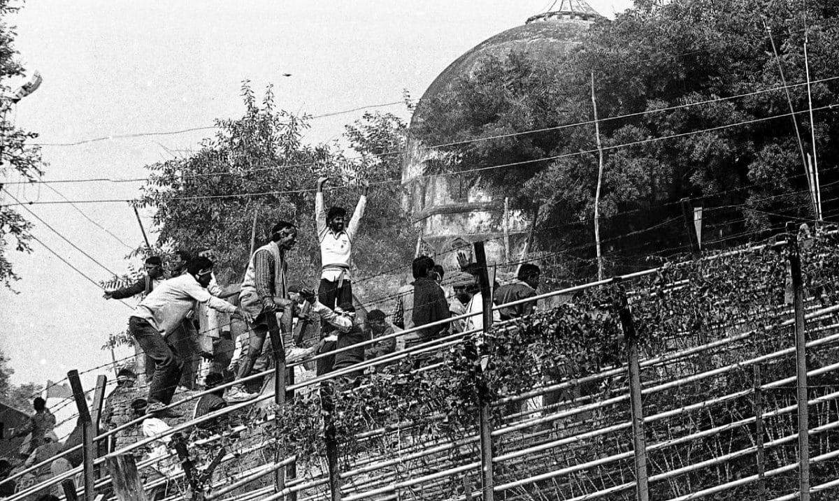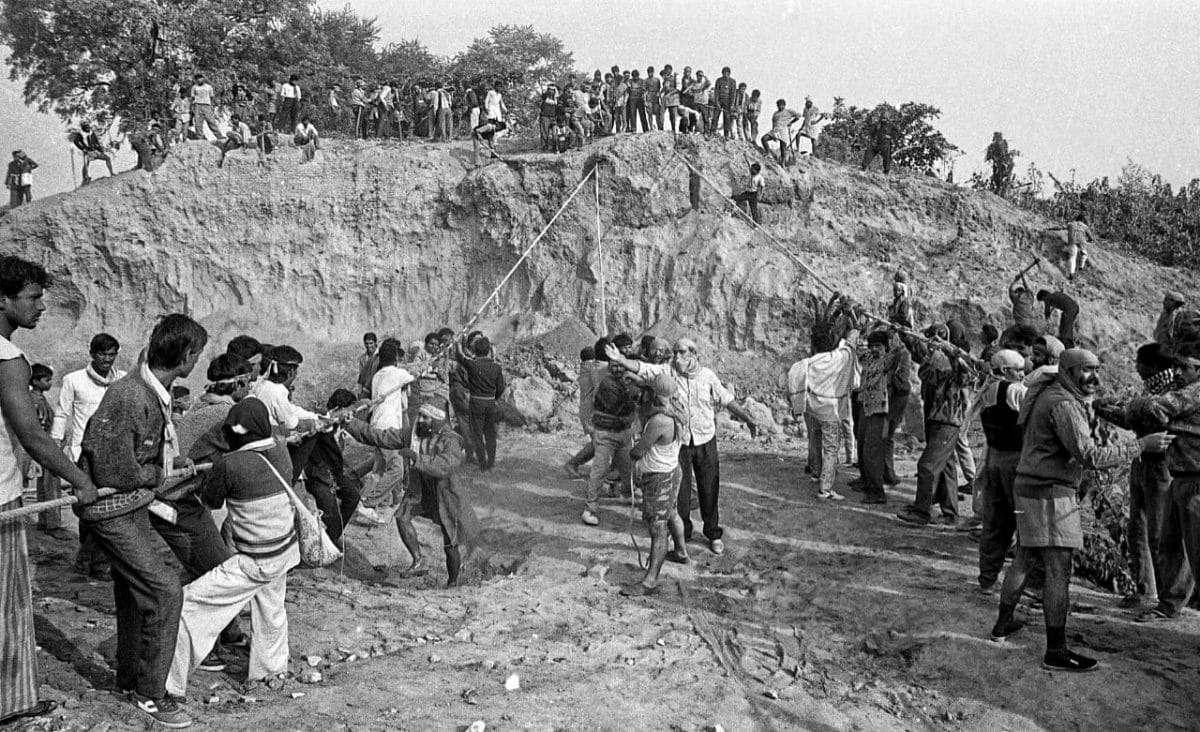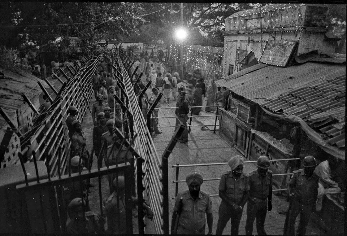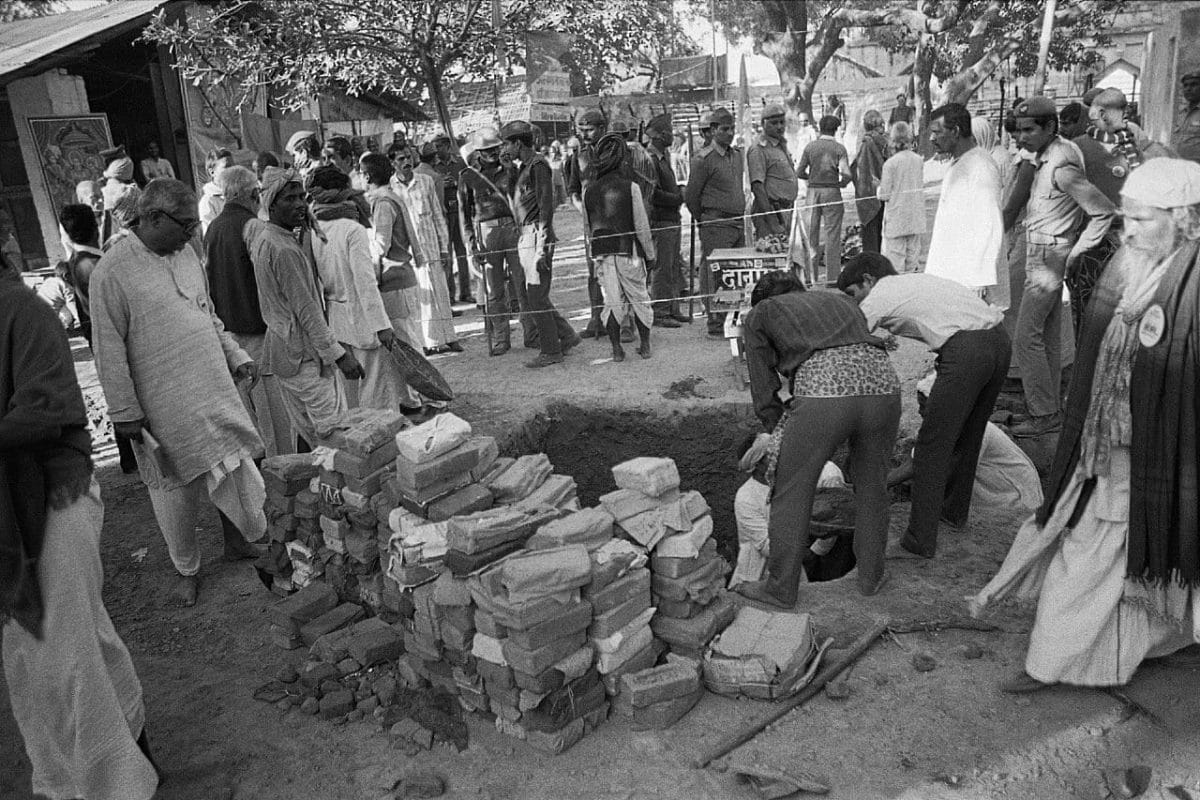 जुलाई 1992 में शिलान्यास समारोह (शिलान्यास) यूपी में कल्याण सिंह की भाजपा सरकार द्वारा अधिग्रहित 2.77 एकड़ भूमि पर हुआ था। फोटो: प्रवीण जैन | दिप्रिंटकार सेवक विवादित स्थल पर प्रस्तावित मुख्य द्वार ‘सिंहद्वार’ के शिलान्यास समारोह के लिए इक्कठा हुए, जहां बाबरी मस्जिद खड़ी थी। फोटो: प्रवीण जैन | दिप्रिंटजुलाई 1992 में समतल की गई और तैयार की गई भूमि पर मानव अस्थियां पाई गईं। यह भूमि राजस्व रिकॉर्ड में मुस्लिम कब्रिस्तान के रूप में दर्ज की गई थी फोटो: प्रवीण जैन | दिप्रिंटतत्कालीन केंद्रीय मानव संसाधन मंत्री अर्जुन सिंह ने तत्कालीन पीएम पी.वी. नरसिम्हा राव से 3 दिसंबर 1992 को लखनऊ के लिए रवाना होने से पहले नई दिल्ली रेलवे स्टेशन पर एक फोन बूथ से बात की वह अयोध्या में स्थिति की निगरानी के लिए वहां गए थे फोटो: प्रवीण जैन | दिप्रिंटबाबरी मस्जिद के विध्वंस से एक दिन पहले 5 दिसंबर को, एक कारसेवक ने एक दीवार पर लिखा रक्त देंगे प्राण देंगे फोटो: प्रवीण जैन | दिप्रिंटवास्तविक विध्वंस से एक दिन पहले रिहर्सल के दौरान, उत्तर प्रदेश का एक पुलिसकर्मी जय श्री राम ’के नारे लगाते हुए कारसेवकों में शामिल हुआ, जो राम जन्मभूमि आंदोलन से जुड़ा था फोटो: प्रवीण जैन | दिप्रिंटकार सेवक 5 दिसंबर 1992 को हथौड़ों के साथ कतार में खड़े हुए । फोटो: प्रवीण जैन | दिप्रिंटएक आदमी, जिसका चेहरा ढंका हुआ है, पूर्वाभ्यास के दौरान कारसेवकों को निर्देश देता हुआ । फोटो: प्रवीण जैन | दिप्रिंटबाबरी मस्जिद के विध्वंस से पहले की रात । फोटो: प्रवीण जैन | दिप्रिंटसुप्रीम कोर्ट की अनुमति के बाद 6 दिसंबर को, कारसेवकों ने सरयू नदी से रेत और पानी लाया । फोटो: प्रवीण जैन | दिप्रिंटविध्वंस की सुबह, भाजपा नेता एल.के. आडवाणी ने राम जन्मभूमि आंदोलन के नेताओं से मुलाकात की। फोटो: प्रवीण जैन | दिप्रिंटजब बाबरी मस्जिद को गिराया जा रहा था, तब कई भाजपा नेता घटना स्थल पर थे। चित्र (बाएं से): मुरली मनोहर जोशी, भाजपा के तत्कालीन अध्यक्ष, एल.के. आडवाणी और विजयाराजे सिंधिया। फोटो: प्रवीण जैन | दिप्रिंटबाबरी मस्जिद को ध्वस्त करते हुए कार सेवक। फोटो: प्रवीण जैन | दिप्रिंटराम कथा कुंज में, विश्व हिंदू परिषद के नेता अशोक सिंघल (खड़े) और उमा भारती ( दाईं ओर पीछे) राजनाथ सिंह (कैमरे के पास बैठे) से मिलते । फोटो: प्रवीण जैन | दिप्रिंटविध्वंस के बाद आडवाणी का दिल्ली में पत्नी कमला आडवाणी और नरेंद्र मोदी द्वारा स्वागत किया गया (दाहिने ओर) । फोटो: प्रवीण जैन | दिप्रिंट
