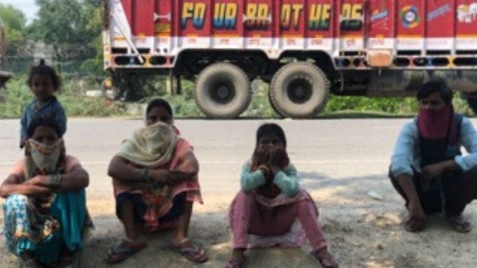 प्रवासी मज़दूर टोलियां बनाकर लखनऊ-हरदोई-शाहजहांपुर हाईवे पर इस उम्मीद में बैठे हैं कि वहां से गुज़रने वाला कोई ट्रक या कार,आख़िरकार उन्हें उनके घर पहुंचा देगा.
