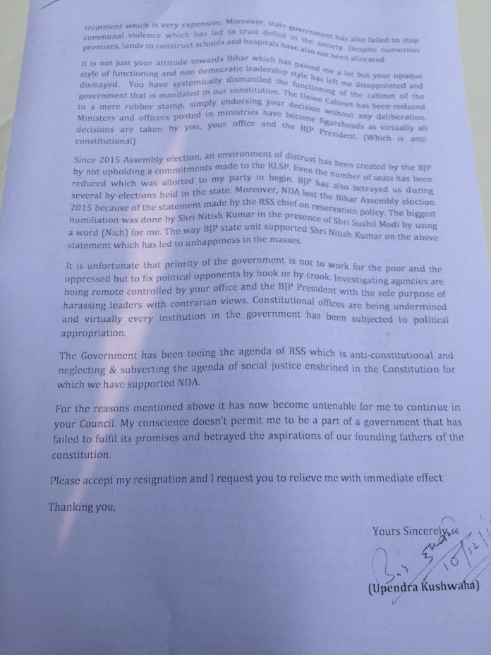 कुशवाहा की पार्टी के एक नेता ने नाम न बताने की शर्त पर कहा था कि मानव संसाधन विकास राज्य मंत्री कुशवाहा का भाजपा ने लगातार अपमान और नजरअंदाज किया है, जिससे वह ‘काफी आहत’ हैं.
