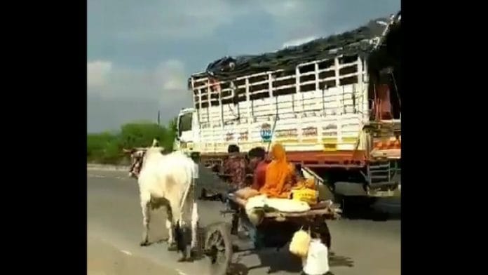 बैल के साथ गाड़ी में जुता व्यक्ति वीडियो में कहता सुनायी पड़ता है, ‘मैं (इंदौर शहर के पास स्थित) पत्थरमुंडला गांव का रहने वाला हूं और (नजदीकी कस्बे) महू से निकला हूं. गाड़ी में मेरी भाभी और छोटा भाई बैठे हैं. हम गांव-देहातों की ओर जा रहे हैं.’