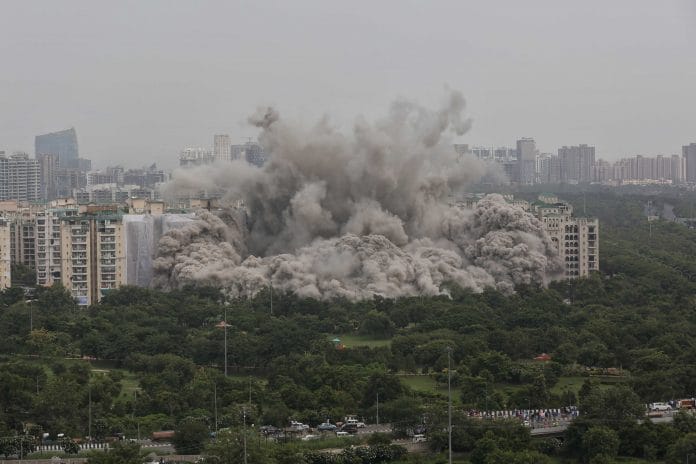 नई दिल्ली: धुएं के एक बादल ने रविवार दोपहर 2.30 बजे नोएडा सेक्टर 93ए को ढक लिया लेकिन केवल कुछ सेकंड्स के लिए. एक जोरदार धमाके के साथ नोएडा के सुपरटेक ट्विन टॉवर्स- एपेक्स (32 मंजिला) और सिएन (29 मंजिला) मलबे में तब्दील हो गए, जिससे पहले महीनों तैयारी की गई, 3,500 किलोग्राम विस्फोटक इस्तेमाल किए गए और 500 करोड़ रुपए खर्च हुए. इसके साथ ही एमिराल्ड कोर्ट के निवासियों और सुपरटेक लिमिटेड के अधिकारियों के बीच एक दशक से चली आ रही लड़ाई का अंत हो गया.