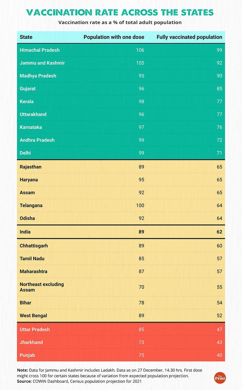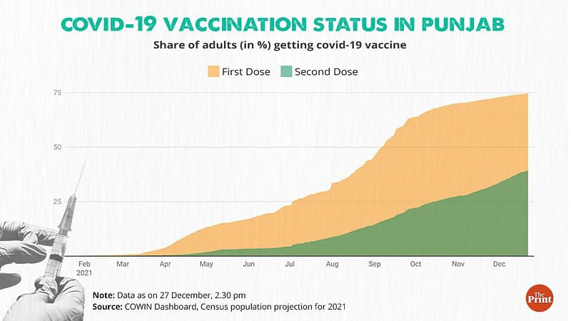 दिप्रिंट ने इस साल अक्टूबर में देश के विभिन्न राज्यों में टीकाकरण की स्थिति का आकलन किया था, जिससे पता चला कि उस समय, पंजाब की लगभग 70 प्रतिशत वयस्क आबादी को टीके का कम से कम एक शॉट मिल चुका था और केवल 26 प्रतिशत का ही पूरी तरह टीकाकरण हो पाया था.