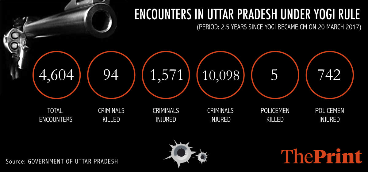 आंकड़ों के मुताबिक, योगी सरकार के 2.5 साल के कार्यकाल के दौरान 4,604 पुलिस मुठभेड़ हुईं. इनमें अब तक 94 अपराधी एनकाउंटर में ढेर हुए हैं, 1571 घायल हुए हैं. इस दौरान पुलिस ने 10098 अपराधियों को गिरफ्तार किया है. जबकि 5 पुलिसकर्मी भी शहीद हुए हैं, 742 पुलिसकर्मी घायल हुए हैं.