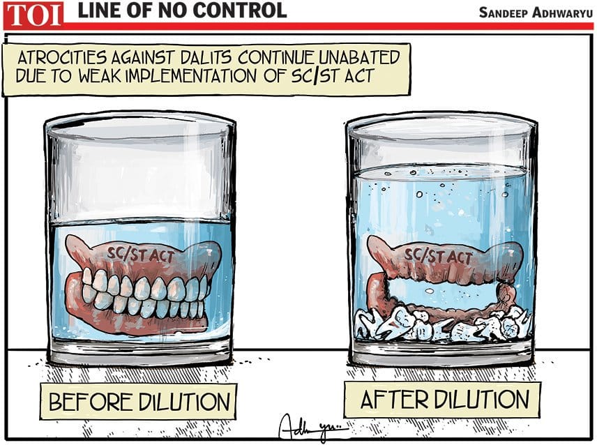 अनुसूचित जाति/अनुसूचित जनजाति (एससी/एसटी) के ऊपर सर्वोच्च न्यायालय के हालिया अत्याचार निरोधक आदेश को कम करने के फैसले और इसके परिणामस्वरूप भारत बंद आज के कार्टून का प्रमुख विषय था।