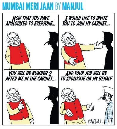 मिड-डे संस्करण में मंजूल ने अरविंद केजरीवाल के माफी मांगने पर खूब मजाक उड़ाया, जिसमें उन्होंने वित्त मंत्री अरुण जेटली से माफी मांगी। उन्होंने सुझाव दिया कि केजरीवाल की माफी का मोदी के मंत्रिमंडल में बहुत ही अच्छा उपयोग किया जाएगा।