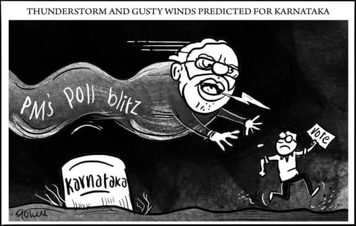 द एशियन एज में, गोकुल गोपालकृष्णन दिखाते हैं कि कर्नाटक में तूफान पर वार करने वाली मोदी की टिप्पणियाँ, चुनाव से पहले दिए जाने वाले भाषणों की तरह लगती हैं।