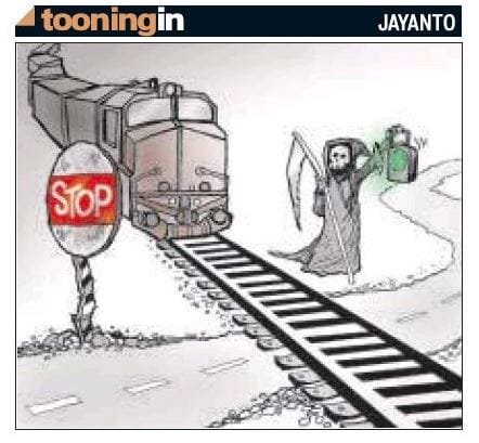 हिंदुस्तान टाइम्स में जयंतो उत्तर प्रदेश में गुरुवार को हुई दर्दनाक दुर्घटना को दिखाते हैं, जहाँ एक मानव रहित क्रॉसिंग पर एक स्कूल वैन, ट्रेन से टकरा गई जिसमें 13 मासूम बच्चों की मौत हो गई। जयंतो दिखाते हैं कि ये मौतें देश में मानव रहित रेलवे क्रॉसिंग पर नियंत्रण की तरफ इशारा कर रही हैं।