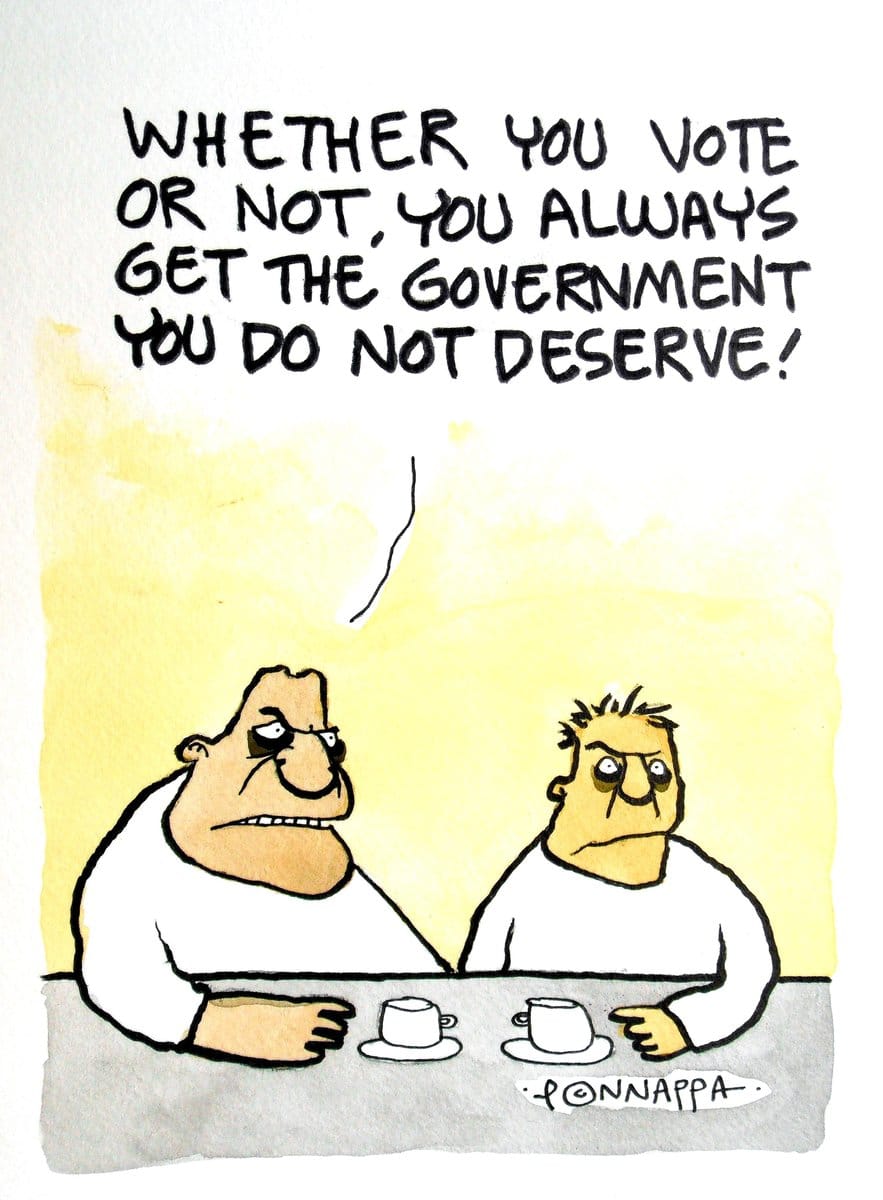 कार्टूनिस्ट नाला पोनप्पा भारत में अधिकांश मतदाताओं की इस वास्तविकता को दिखाते हैं, कि उन्हें कोई फर्क नहीं पड़ता कि वो किसके लिए मतदान करते हैं, वे उनके सत्ता में आने के बाद लगभग हमेशा मायूस हो जाते हैं।