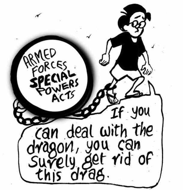 मुख्य कार्टून में, इन्डियन एक्सप्रेस के ई.पी. उन्ने ने कट्टरपंथी एफएसपीए कानून का मजाक उड़ाया। जबकि नरेंद्र मोदी शी जिनपिंग से मुलाकात कर रहे हैं, एफएसपीए कानून अत्यधिक महत्वपूर्ण है जो लोकतंत्र होने के बावजूद भारत में जारी है।