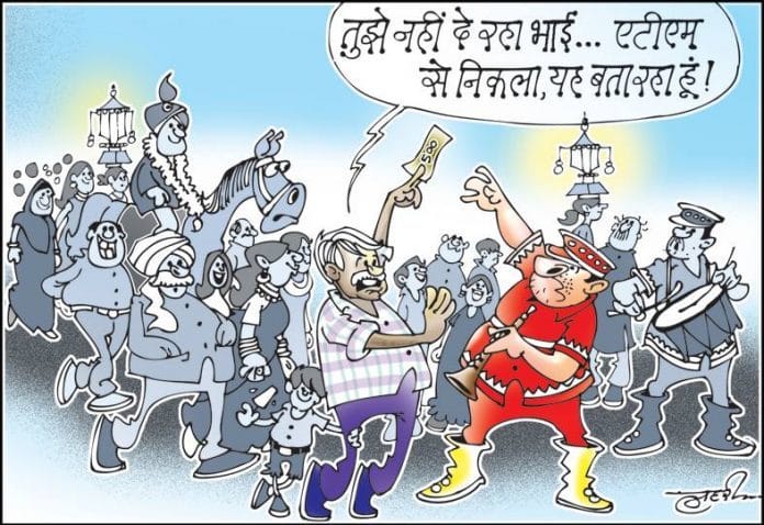 इंदौर के कार्टूनिस्ट लहरी द्वारा अग्रणी कार्टून में, भारत में नगदी संकट एक अत्यधिक हास्यजनक मोड़ लेता है। वे दिखाते हैं कि 500 रूपये के नोट, जो अब वैध मुद्रा नहीं हैं, अब नगदी की तंगी वाली एटीएम मशीनों से निकल रहे हैं।