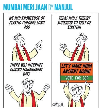 मिड-डे में मंजुल सत्तारूढ़ पार्टी का नया आदर्शवाक्य दिखाते हैं : प्राचीन भारत को पुनः महान बनाओ। प्रधानमंत्री नरेन्द्र मोदी सहित पार्टी के कई लोग अतीत में बेतुके वैज्ञानिक दावे कर चुके हैं, जैसे ये दावा करना कि महाभारत काल में इन्टरनेट मौजूद था और हिन्दुओं के भगवान गणेश का अस्तित्व ये सिद्ध करता है कि शल्य चिकित्सा का आविष्कार भारत में हुआ था।