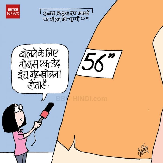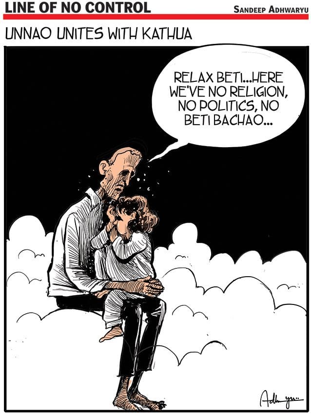 कठुआ और उन्नाव में बलात्कार के मामलों ने भारतीयों में दहशत पैदा कर दी है और कई लोगों ने इन जघन्य अपराधों के बारे में राजनीतिक वर्ग को न बोलने के लिए उनकी कड़ी आलोचना की है। प्रमुख कार्टून में, टाइम्स ऑफ इंडिया में संदीप अध्वर्यु ने बेटी बचाओ अभियान के खोखले वादों पर प्रकाश डालते हुएउन्नाव और कठुआ के मामलों पर तंज कसा है।