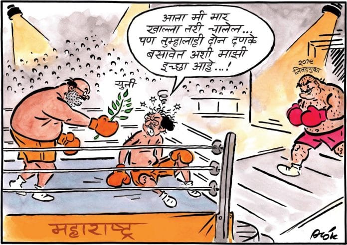 उद्धव ठाकरे: अब ठीक है अगर मैं मार खाता हूँ| लेकिन मैं चाहता हूँ कि आपको भी दो आघात भुगतने चाहिए| (पृष्ठभूमि में 2019 राज्य और राष्ट्रीय चुनाव पहुँच रहे हैं)