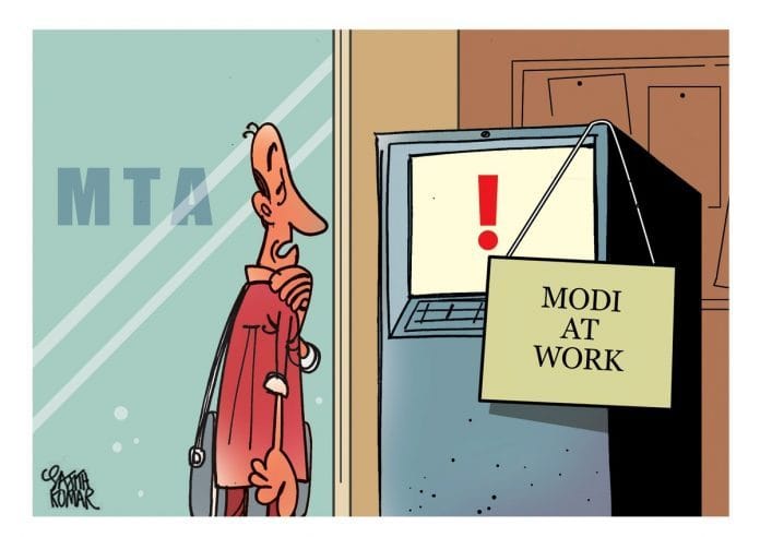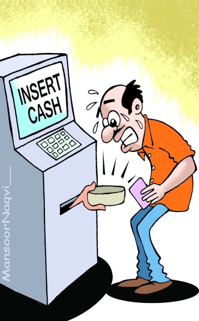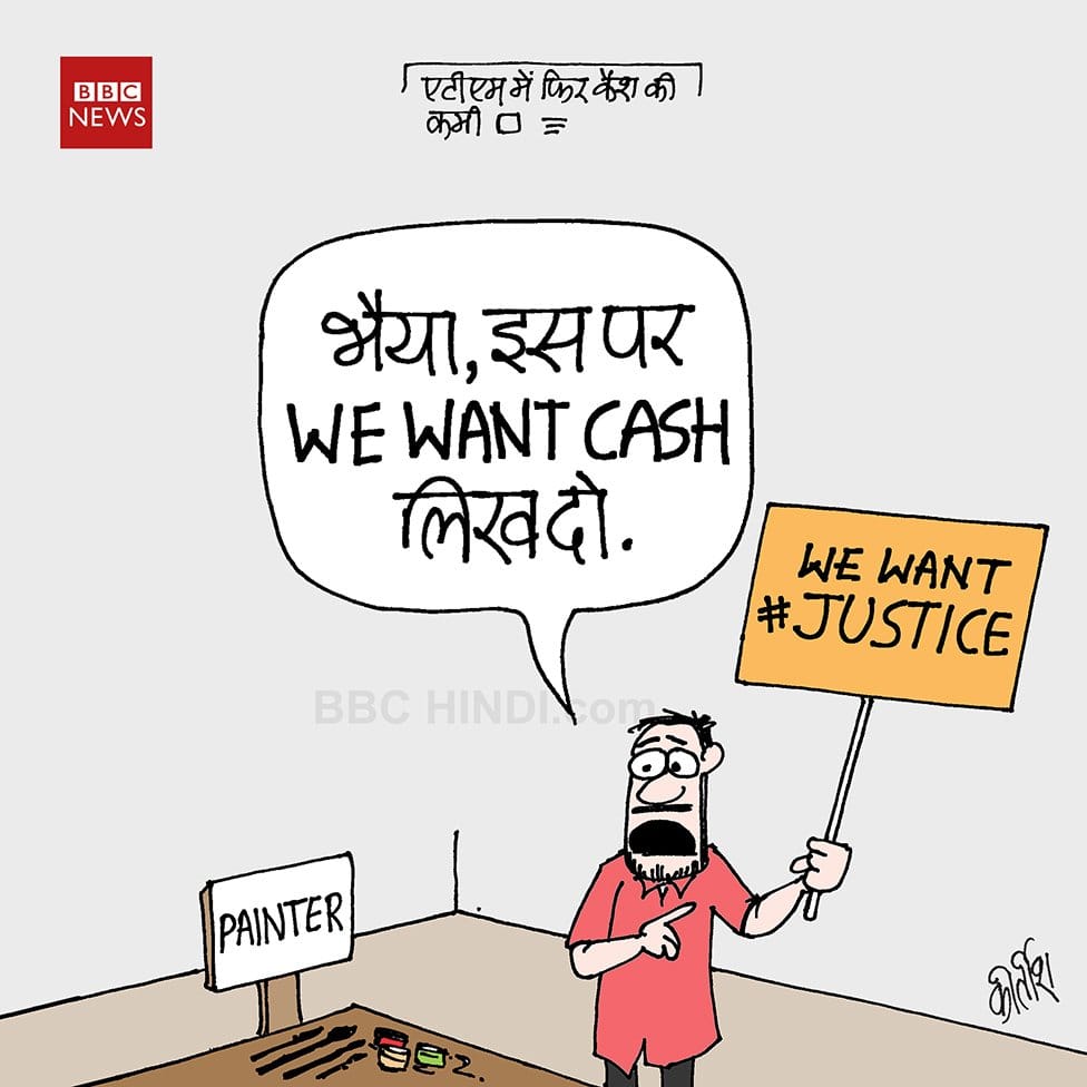 भारत में विपक्षी दलों और कार्टूनिस्टों के लिए ये एक सनसनीखेज दिन था जब ये सूचना मिली थी कि कम से कम छः राज्य एटीएमों में नगदी की कमी का सामना कर रहे थे| सजीथ कुमार, पैसे से खाली चल रहे एटीएम और प्रधानमंत्री मोदी इस समस्या को हल करते हुए, को, एक अग्रणी कार्टून में दर्शाते हुए मजाक उड़ाते हैं|