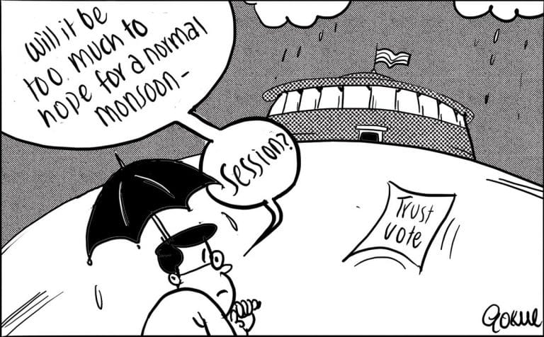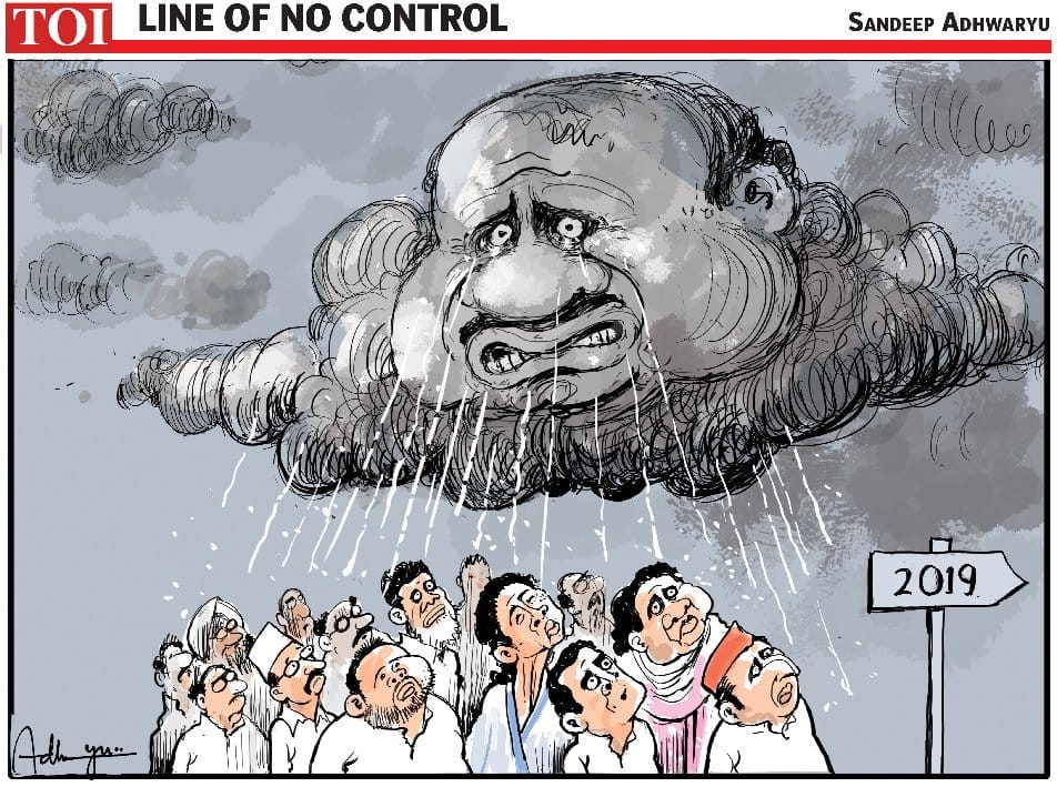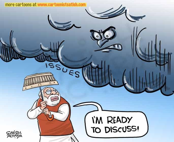 सतीश आचार्य ने नरेंद्र मोदी को दर्शाया है और बताया है की वो संकोच में पड़े हुए है लेकिन संसद के मानसून सत्र में लिंचिंग, मूल्य वृद्धि और कृषि मुद्दों जैसे मुद्दों पर बहस करने के लिए तैयार है ।