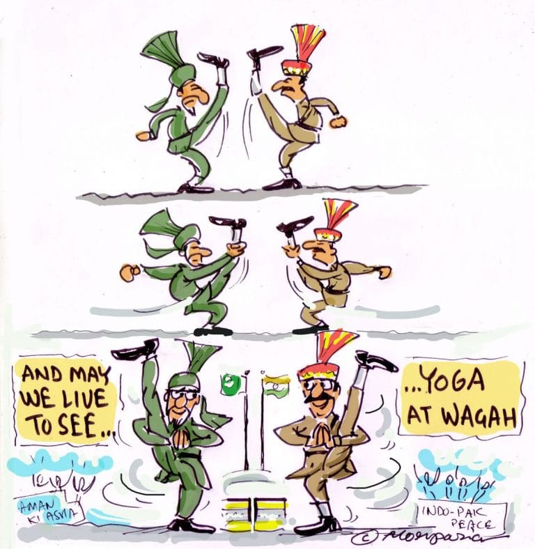 हेमंत मोरपारिया आशा करते हैं की वर्तमान में वाघा सीमा पर ध्वज रोहण समारोह के दौरान आक्रामक शो प्रदर्शन हो सकता है कि दोस्ताना योग इसका स्थान ले सके ।
