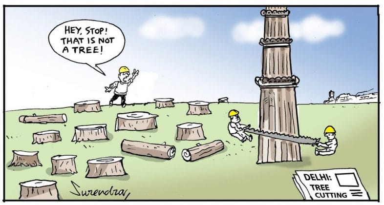 द हिंदू में, सुरेंद्र दिल्ली के प्रस्तावित पेड़-काटने की ड्राइव पर तंज करते है ।
