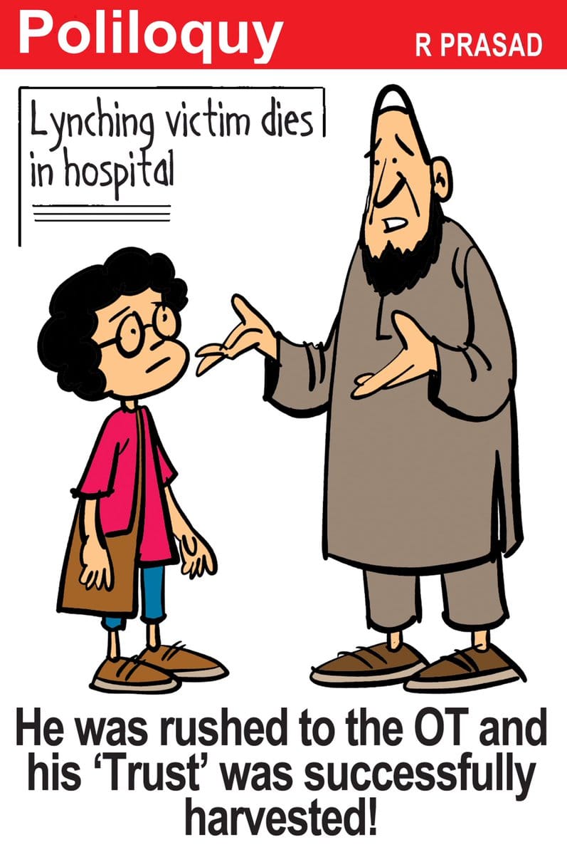 आर प्रसाद अपने कार्टून में दिखाते हैं कि एक ओर बीजेपी ‘सब का साथ, सब का विकास, सब का विश्वास’ का नारा लगा रही है. वहीं, इसी बीच झारखंड में 24 साल के मुस्लिम युवक तबरेज अंसारी की भीड़ द्वारा हत्या कर दी जाती है.