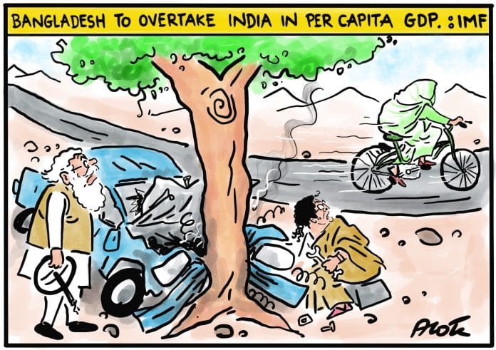 आलोक निरंतर ने हाल ही में अंतर्राष्ट्रीय मुद्रा कोष के पूर्वानुमान जिसमें कहा गया है कि बांग्लादेश इस साल भारत की प्रति व्यक्ति जीडीपी को पार कर आगे निकल जाएगा का चित्रण किया है.