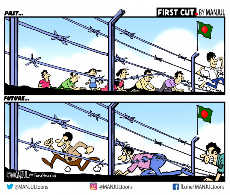 मंजुल अपने कार्टून के जरिए बता रहे हैं कि किस तरह से अंतराष्ट्रीय मुद्रा कोष (आईएमएफ) ने भविष्यवाणी की है कि किस तरह से इस साल भारत के प्रति व्यक्ति सकल घरेलू उत्पाद (जीडीपी) से बांग्लादेश आगे निकल जाएगा. दोनों देशों के बीच माइग्रेशन पैटर्न को पलटने की संभावना है.