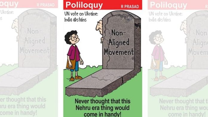 आज के फीचर कार्टून में आर. प्रसाद ने यूक्रेन पर आक्रमण के लिए रूस की निंदा करने वाले एक प्रस्ताव पर संयुक्त राष्ट्र सुरक्षा परिषद में भारत के वोट ना देने की तरफ इशारा किया है. यह नई दिल्ली के लिए पहली बार नहीं था, इसने कॉल्ड वॉर के दौरान कई बार इसी तरह के फैसले लिए थे, जब वह नॉन अलाइंड मूवमेंट का नेता था.
