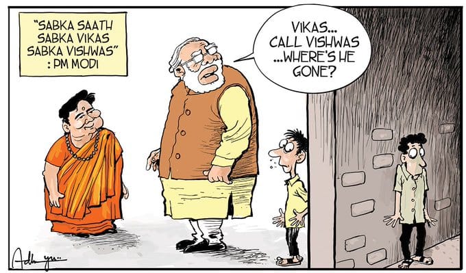 संदीप अध्वर्यु | द टाइम्स ऑफ़ इंडियाद टाइम्स ऑफ इंडिया में संदीप अध्वर्यु ने प्रधानमंत्री नरेंद्र मोदी के भाषण पर एक चुटकी लेते हैं. जिसमें एकता और विकास का वादा किया गया था.