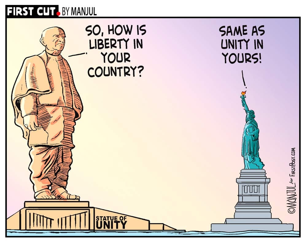 फर्स्टपोस्ट में मंजुल सुझाव देते हैं कि भारत में एकता उतनी ही खतरे में है जितनी संयुक्त राज्य अमेरिका में स्वाधीनता.