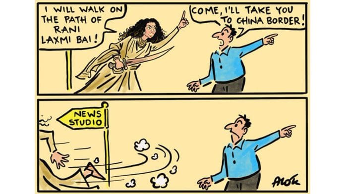 आज के प्रदर्शित कार्टून में, आलोक निरंतर ने अभिनेत्री कंगना रनौत के ‘बोल्ड’ जज्बे और सोशल अपने सोशस मीडिया अकाउंट्स पर इसके परे काम करने के बीच उनकी ‘विसंगतियों’ पर कटाक्ष करते हैं.