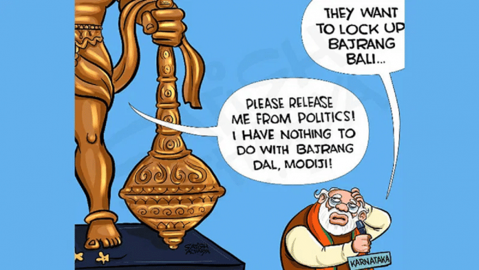 आज के फीचर कार्टून में, सतीश आचार्य ने कर्नाटक चुनाव के लिए कांग्रेस के हाल ही में जारी घोषणापत्र पर ध्यान खींचा है, जिसमें बजरंग दल और पॉपुलर फ्रंट ऑफ इंडिया के खिलाफ कार्रवाई करने की बात की गई है. पीएम मोदी ने इसका जवाब देते हुए कहा था, ‘कांग्रेस को भगवान राम से दिक्कत थी और अब उसे ‘जय बजरंग बली’ कहने वालों से दिक्कत है.