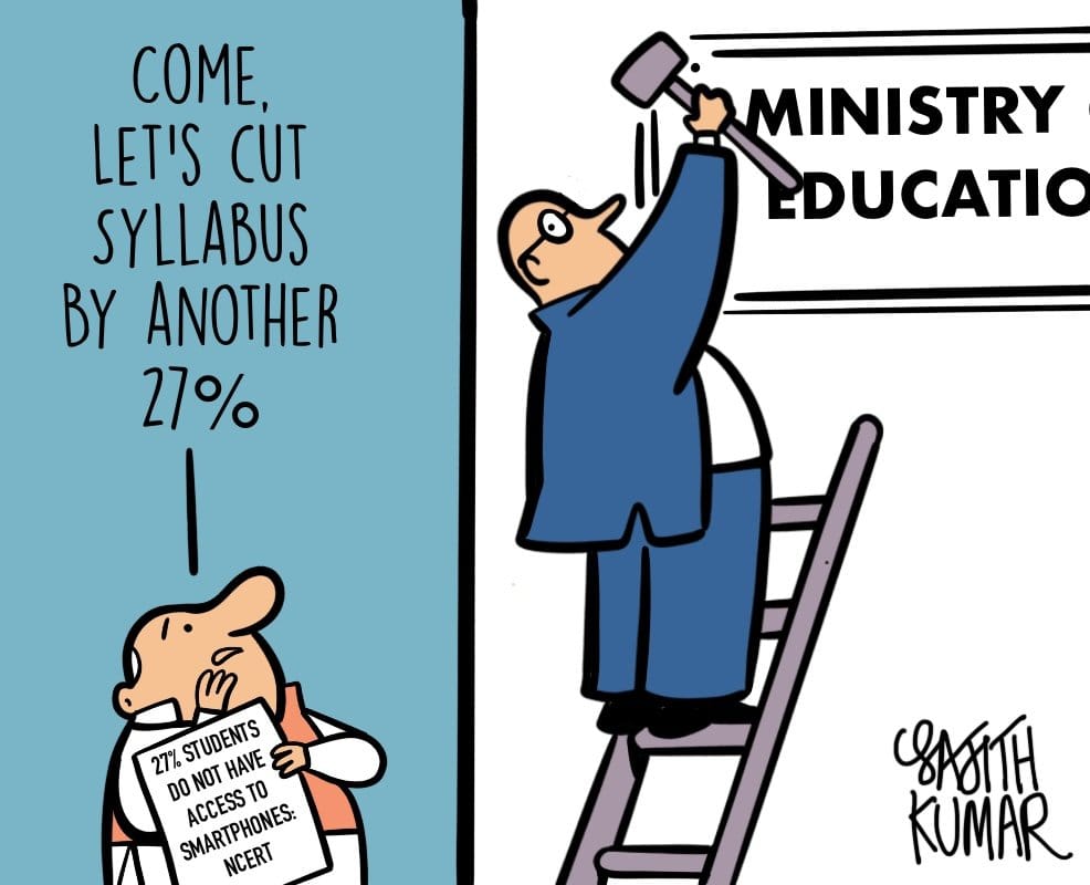 साजिथ कुमार सीबीएसई पाठ्यक्रम को कम करने के लिए शिक्षा मंत्रालय पर तंज कसते हैं. लेकिन महामारी के बीच छात्रों में ऑनलाइन सीखने के लिए समस्या का समाधान खोजने से इनकार कर दिया है.