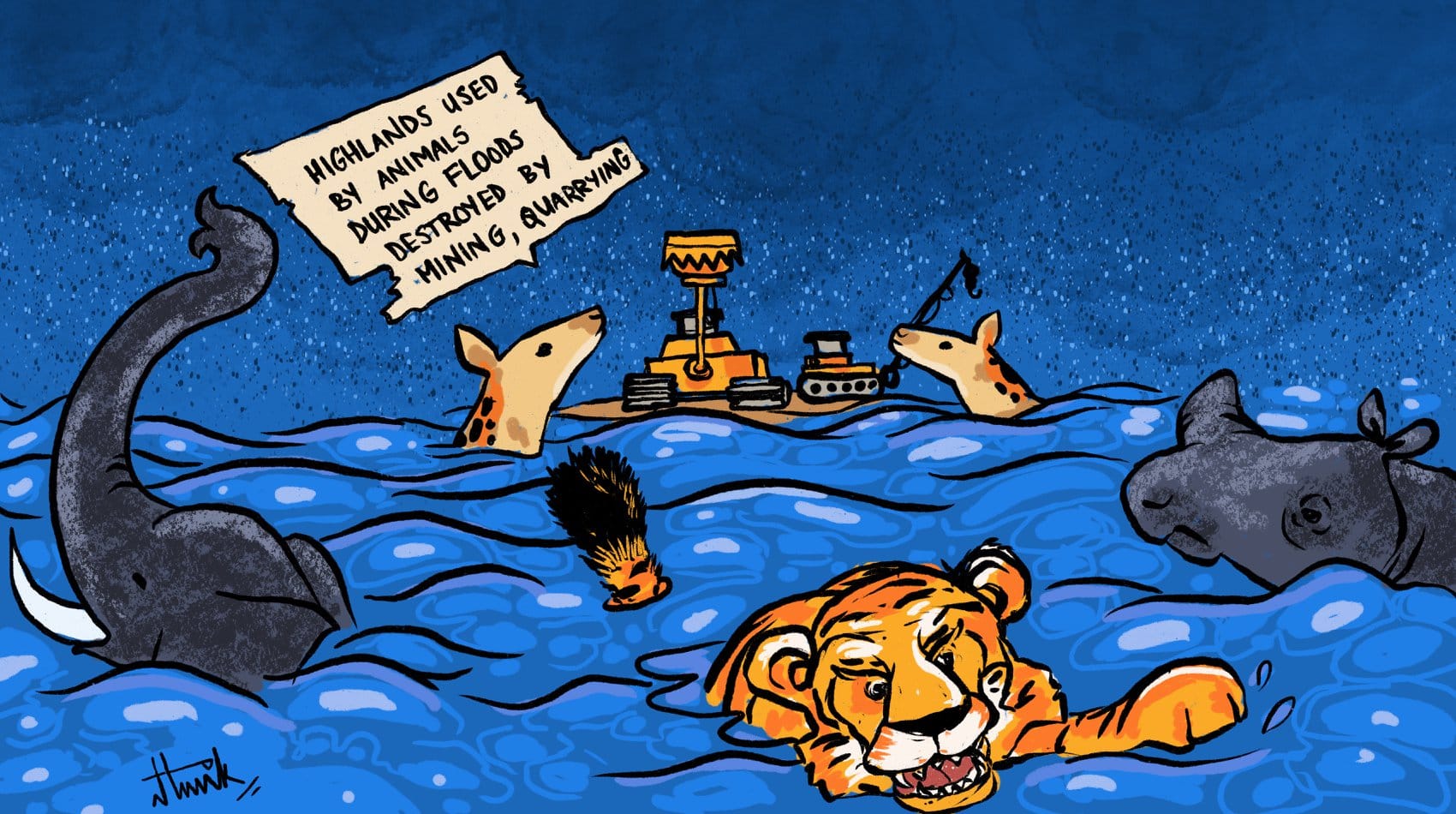 संदीप अध्वर्यु अपने कार्टून में दो बाढ़ प्रभावित राज्य, असम और महाराष्ट्र की स्थिति को दर्शाते हैं. जबकि असम में स्थिति बहुत अधिक गंभीर है, जहां एक राष्ट्रीय उद्यान जलमग्न हो गया है और लाखों लोगों का जीवन प्रभावित हुआ है. मीडिया ने केवल मुंबई को सुर्खियों में रखा है.