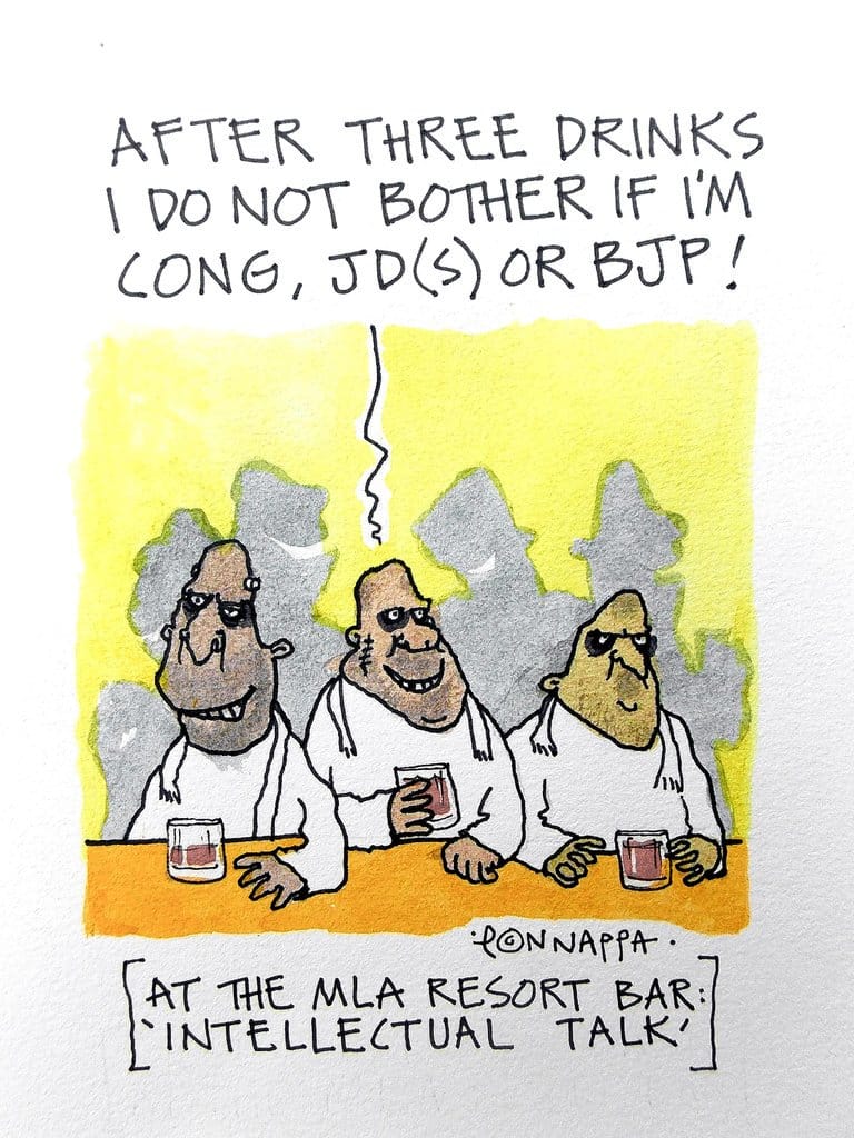 नाला पोनप्पा कर्नाटक की राजनीतिक स्थिति पर तंज कसते हैं, जहां विधायक एक पार्टी से दूसरी पार्टी में जाते दिख रहे हैं. पिछले हफ्ते, 15 बागी विधायकों ने अपने इस्तीफे के बाद मुंबई के एक होटल में डेरा डाल दिया था.